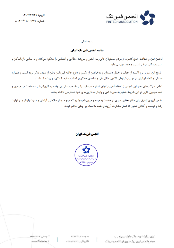 انجمن فین‌تک شهادت جمع کثیری از مردم، مسئولان عالی رتبه کشور و نیروهای نظامی و انتظامی را محکوم می کند و به تمامی بازماندگان و آسیب دیدگان عرض تسلیت و همدردی می نماید.